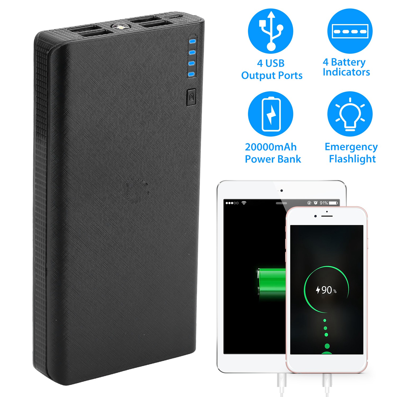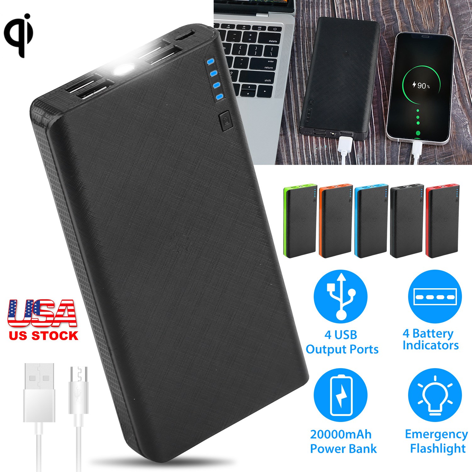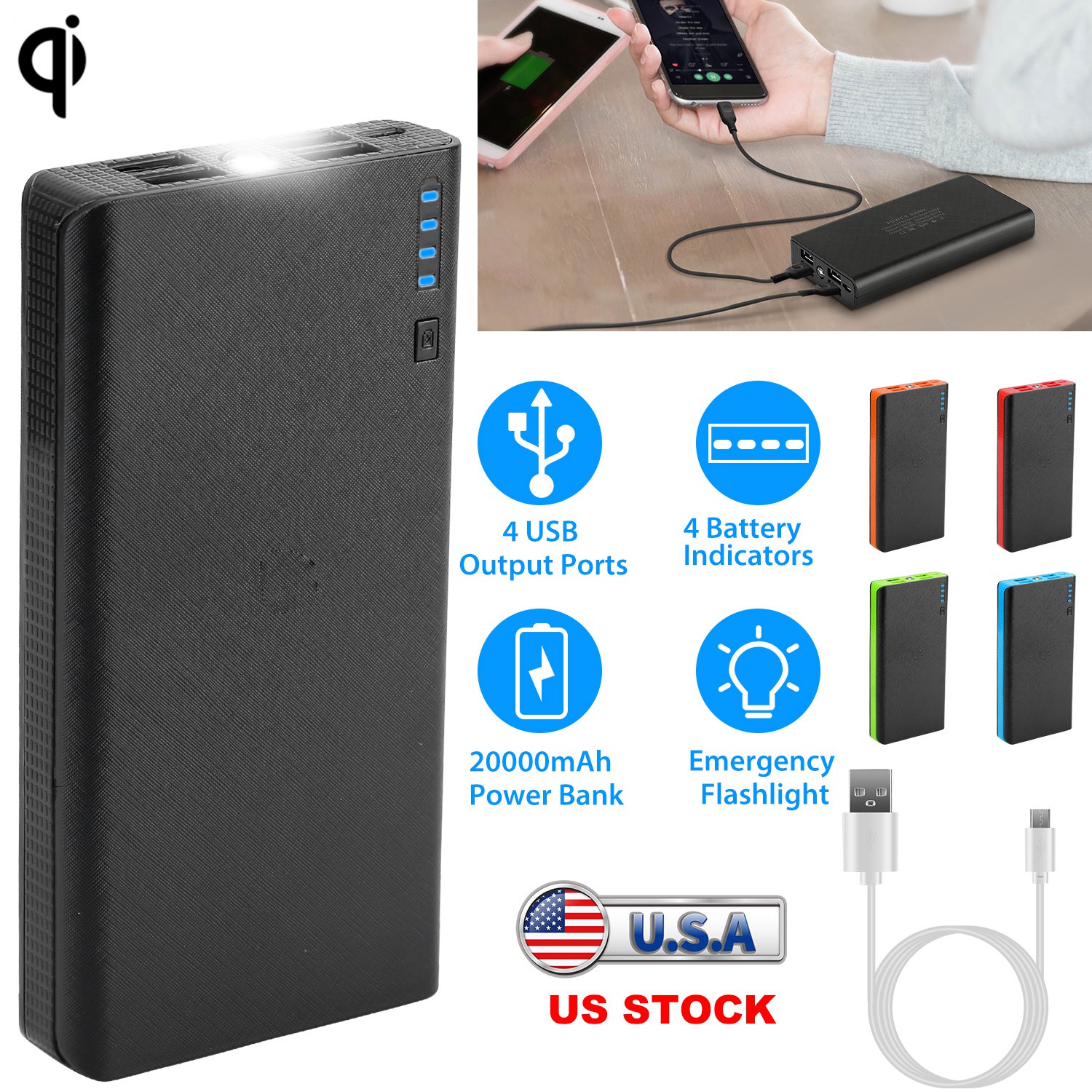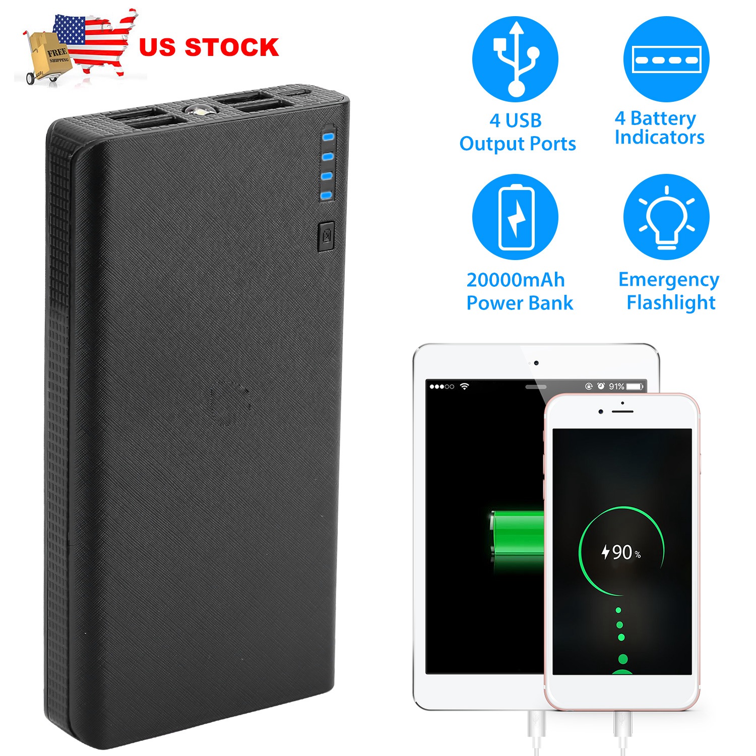 20000mAh Phone Power Bank 4-Port Multi USB External Battery Pack Portable Tablet PC Mobile Phone Charger W/ Power Display LED Flashlight