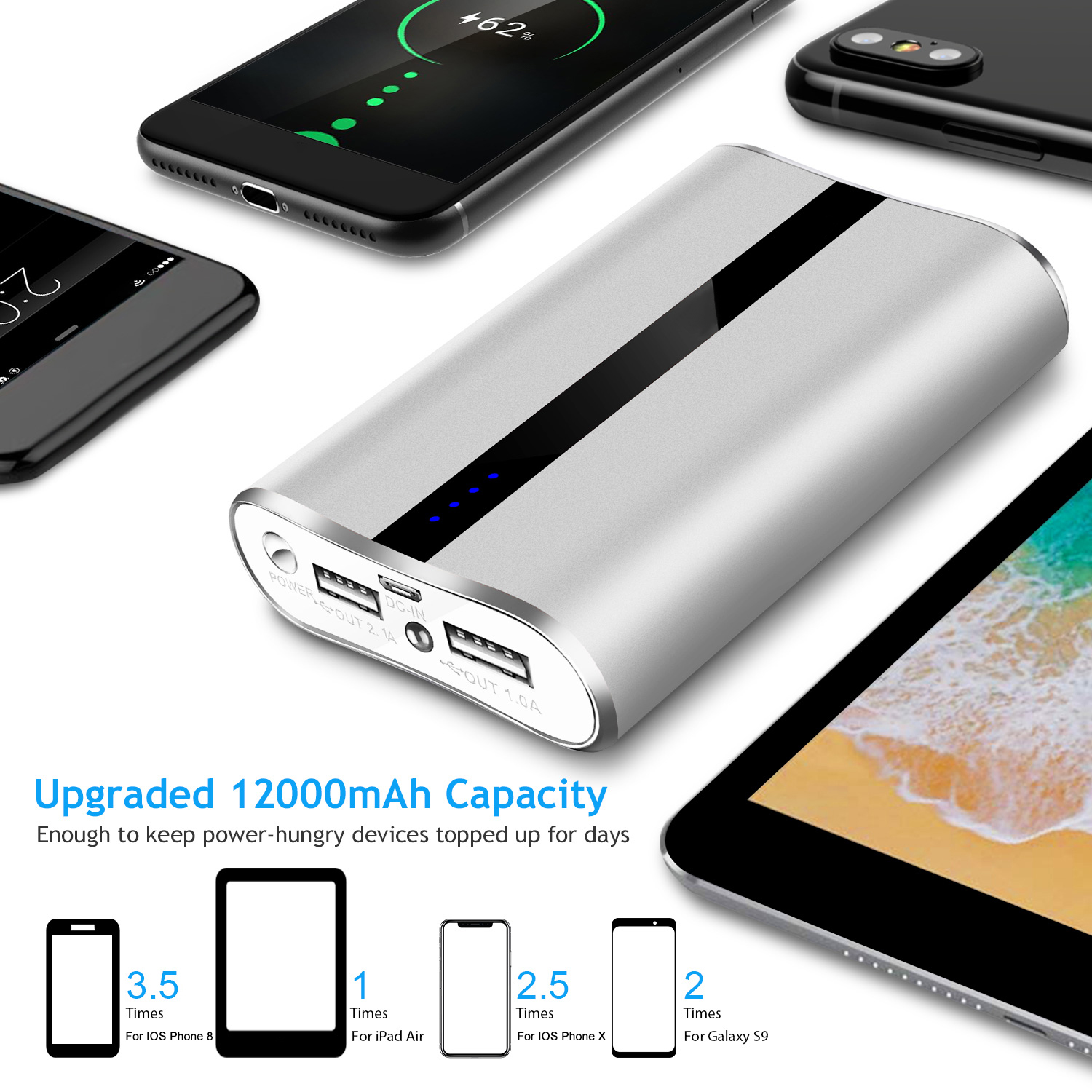 12000mAh Portable Charger with Dual USB Ports 3.1A Output Power Bank Ultra-Compact External Battery Pack Fast Charging for IOS Phone Samsung Xiaomi ZT