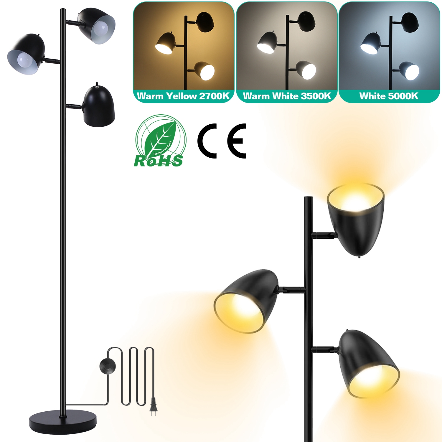 Home > Black Tree Standing Floor Lamp Metal 3 Color Temperature Reading LED Bulb Light 360 Degree Adjustable Individual Separate Switch Living Room Bedroom O