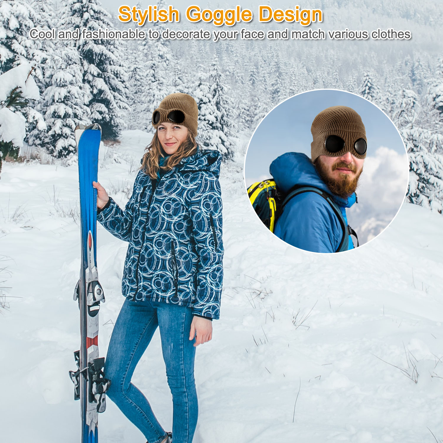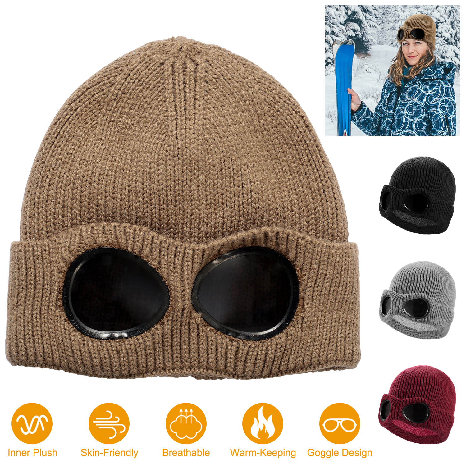 Unisex Knit Beanie Hat with Goggle Chunky Winter Warm Hat Skull Cap 4 Colors
