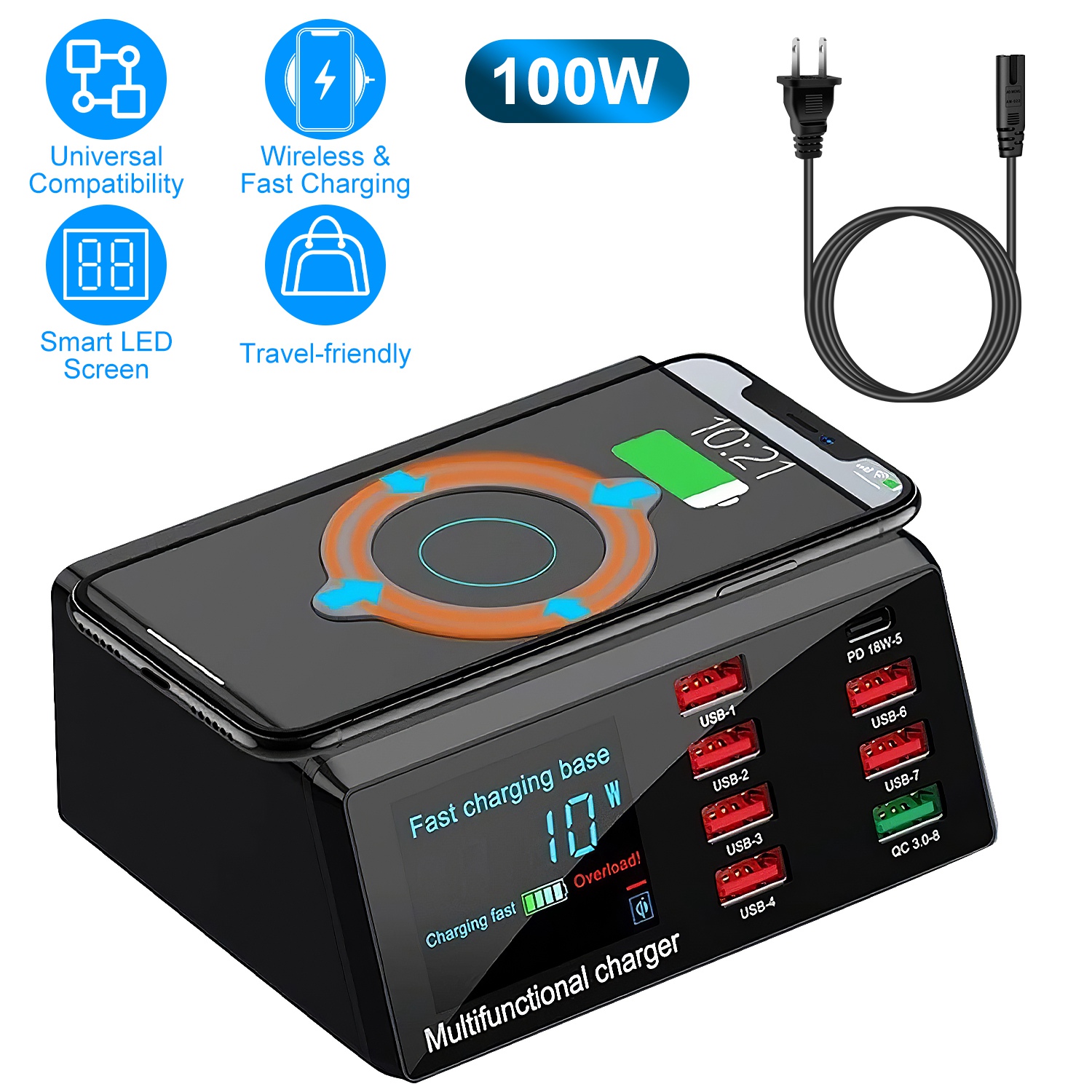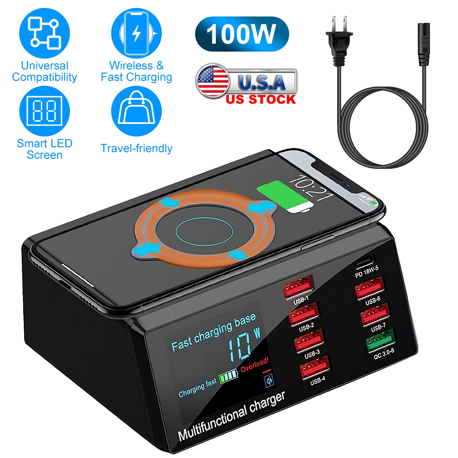 100W USB Charger Hub 8-Port USB Charging Station with LCD Display Wireless Charging Pad Wireless Fast Charger PD20W Port QC3.0 Port 6 USB Ports for IO