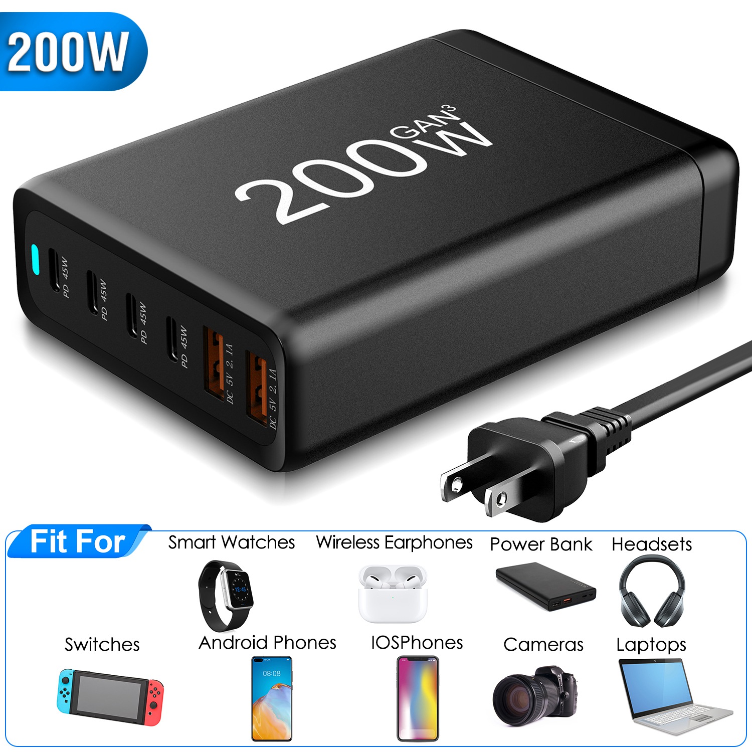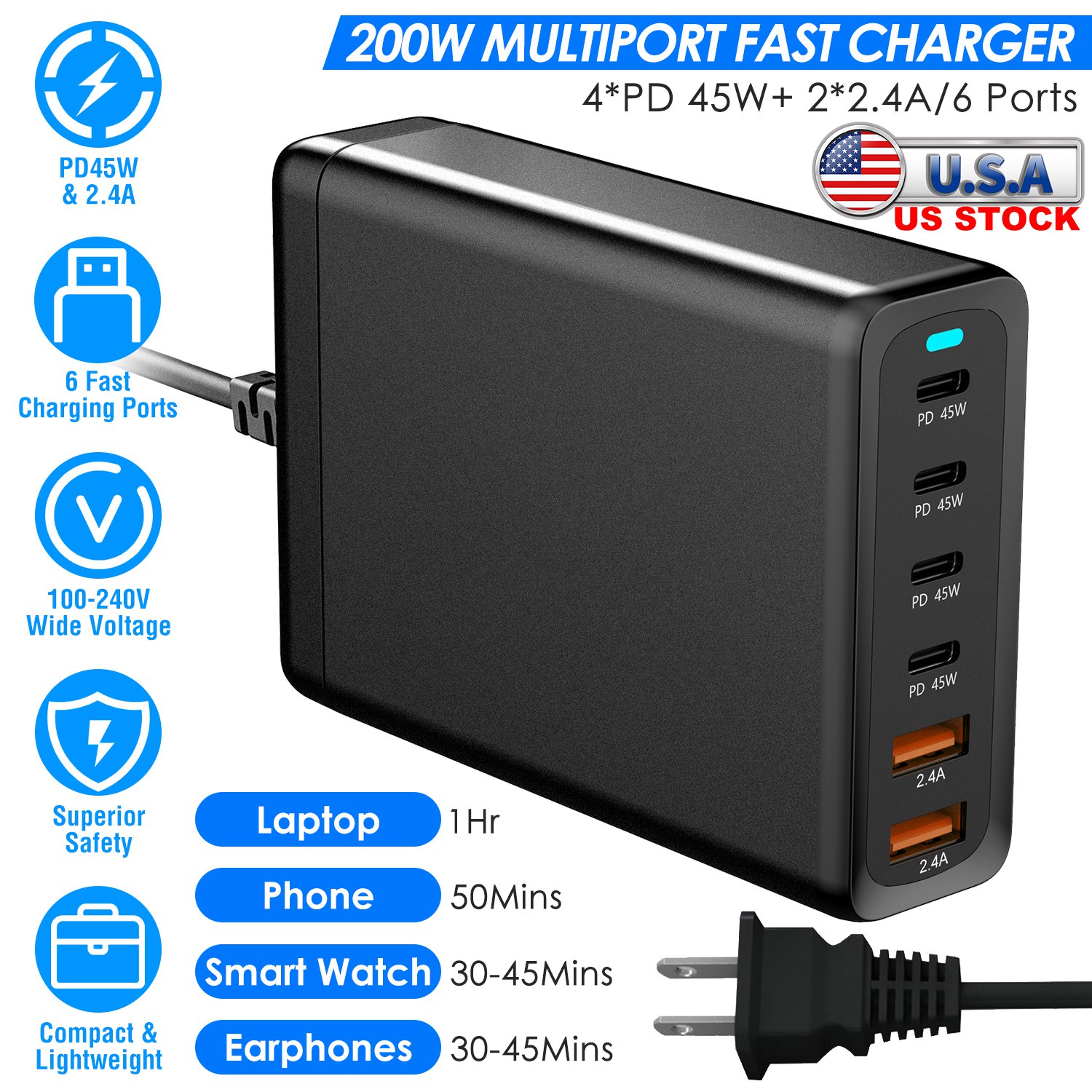 200W Fast Wall Charger with 6 Charging Ports Desktop USB Charging Station PD45W 2.4A GaN Power Adapter Fit for IOSPhone 14 13 12 11 Samsung S22 S21 Sw