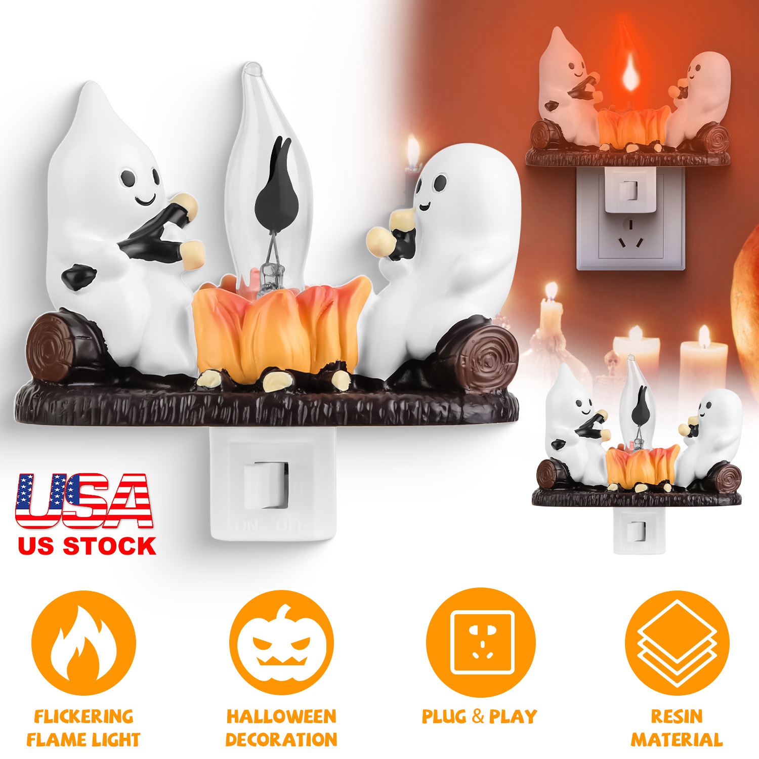 2Pcs Ghost Campfire Flickering Flame Night Light Indoor 3D Funny Halloween Nightlight Decoration Bedroom Night Light Halloween Decoration Gift For Fri
