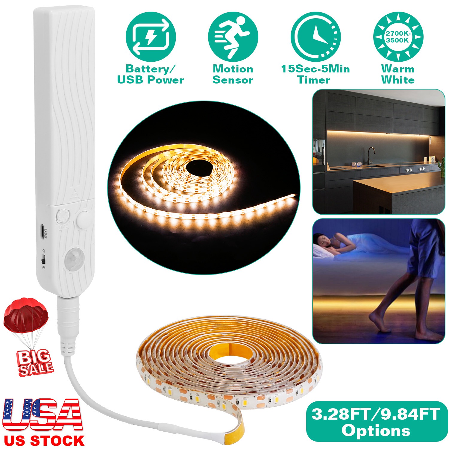 9.84FT PIR Motion Sensor Strip Light Battery Powered LED Light Strip USB String Night Lamp with Auto Shut-Off Timer for Kitchen Under Cabinet Wardrobe