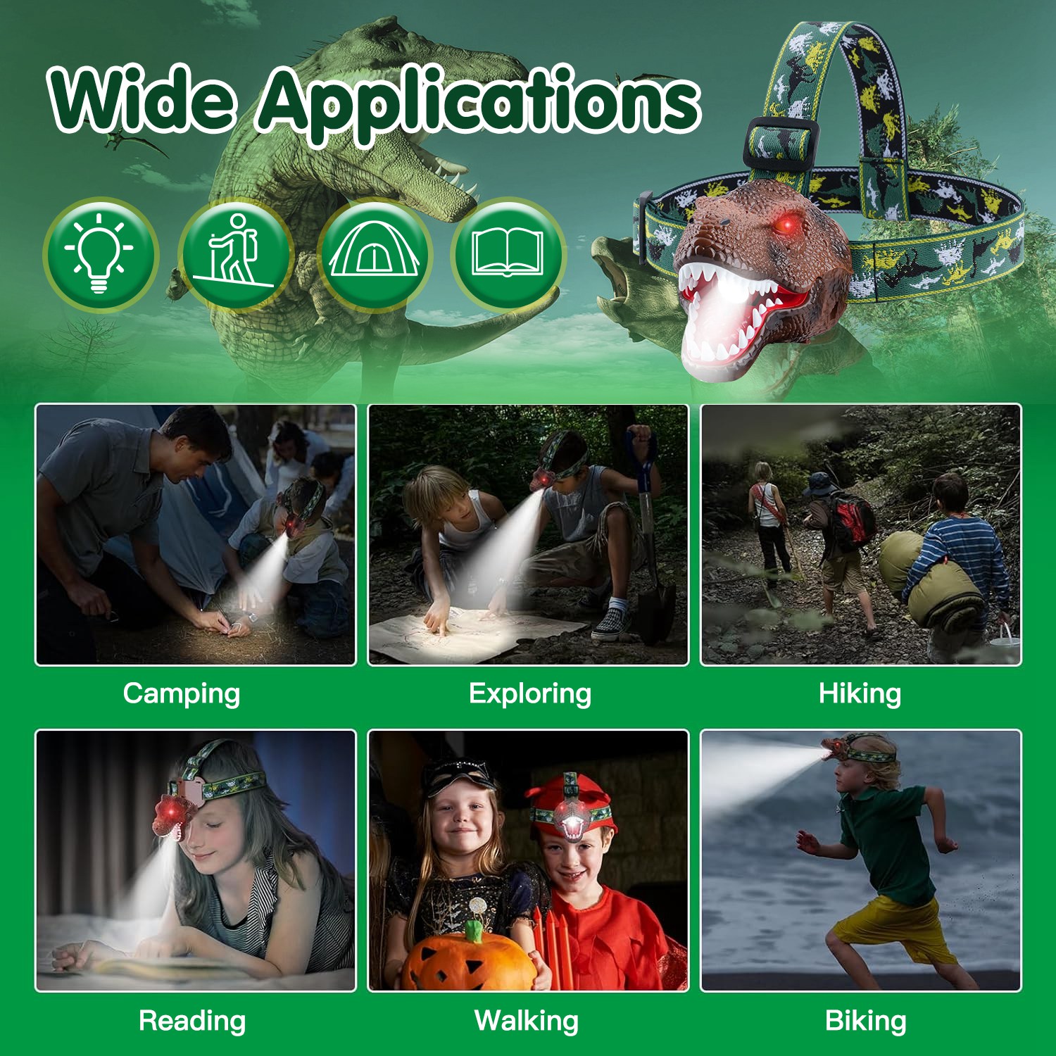 Home > Dinosaur Headlamp Kids Headlight Dinosaur Flashlight with Realistic Roar Sound 4 Modes Adjustable Headband Kid Camping Gear Unique Gifts for Boys