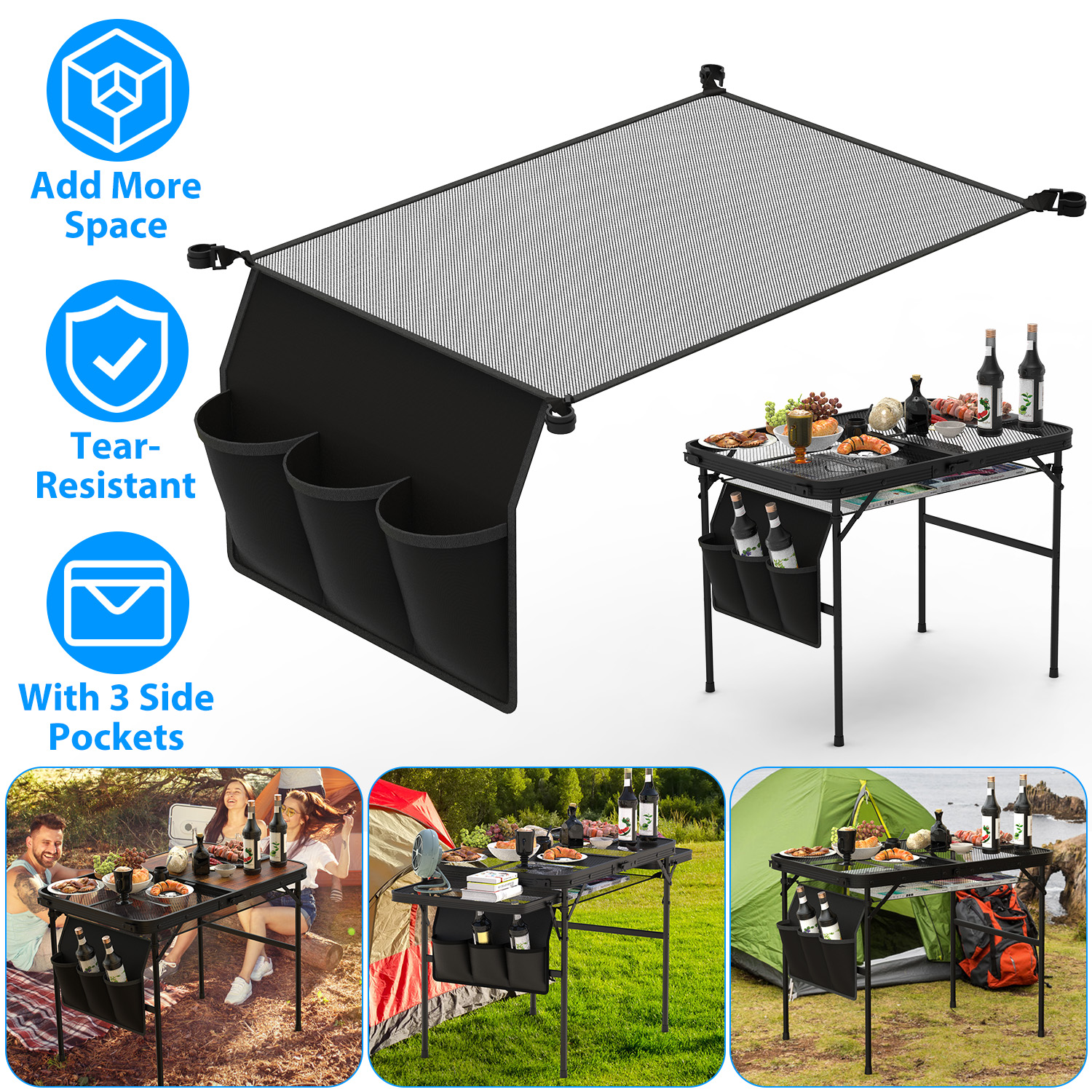 Home > Hanging Storage Net for 35.43x23.62 Camping Table Under Table Folding Net Bag Tear-Resistant with 3 Side Pockets 4 Corner Clips for Camping Hiking Fis
