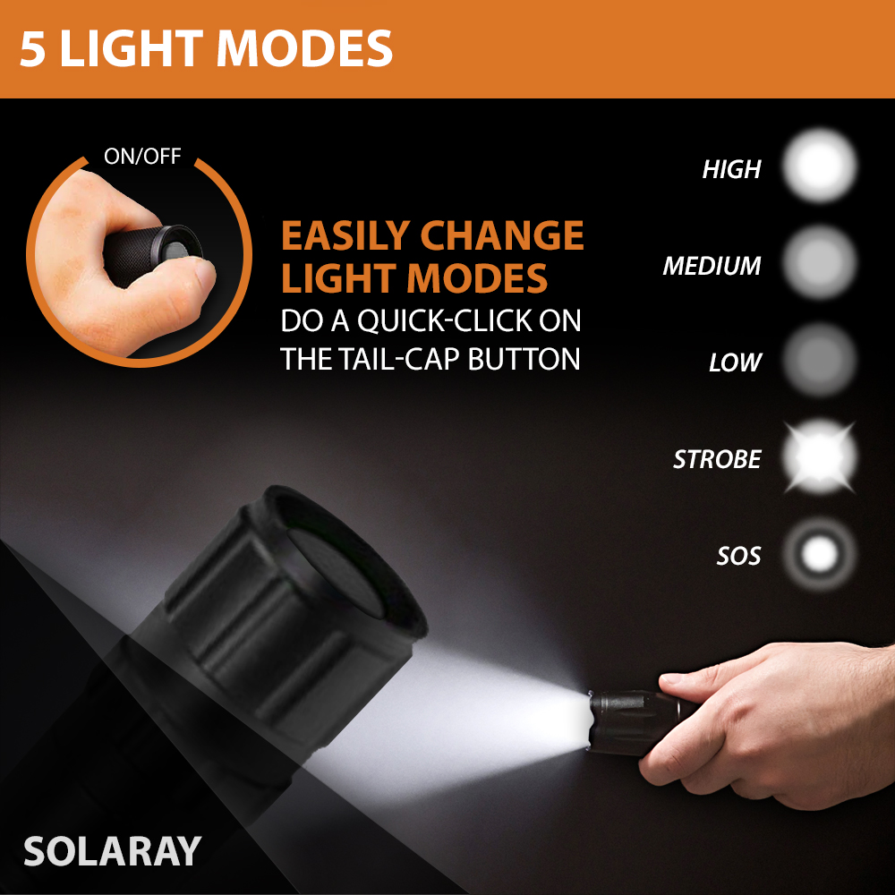 - 5 Light Modes: High, Medium, Low, Strobe and SOS